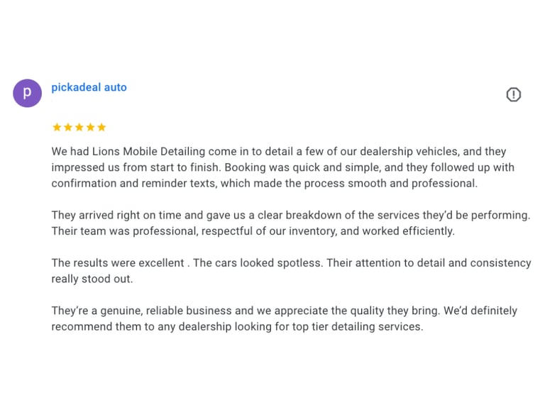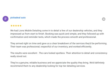 A detail usually takes 2-3 hours depending on the package and condition of the vehicle.